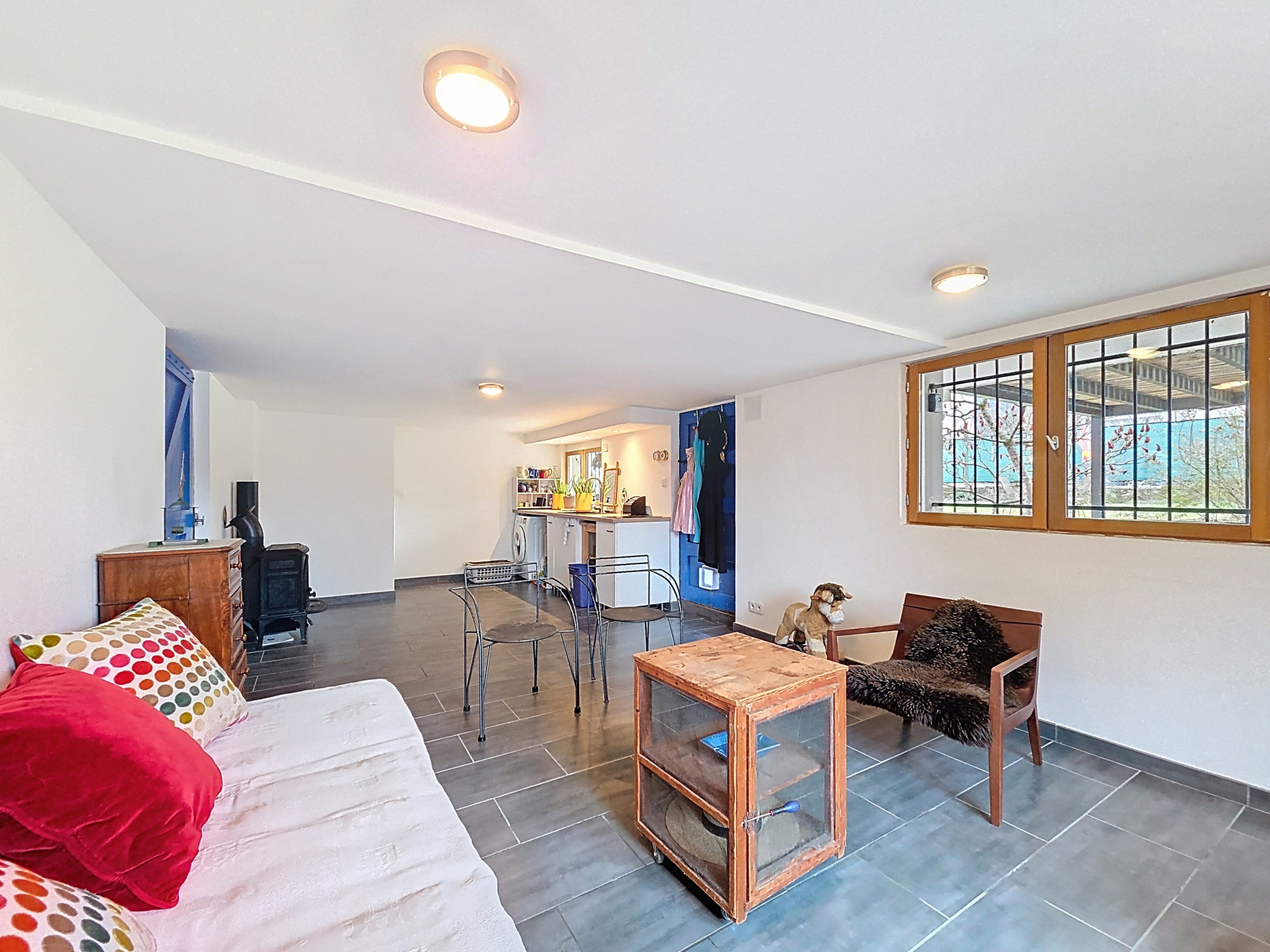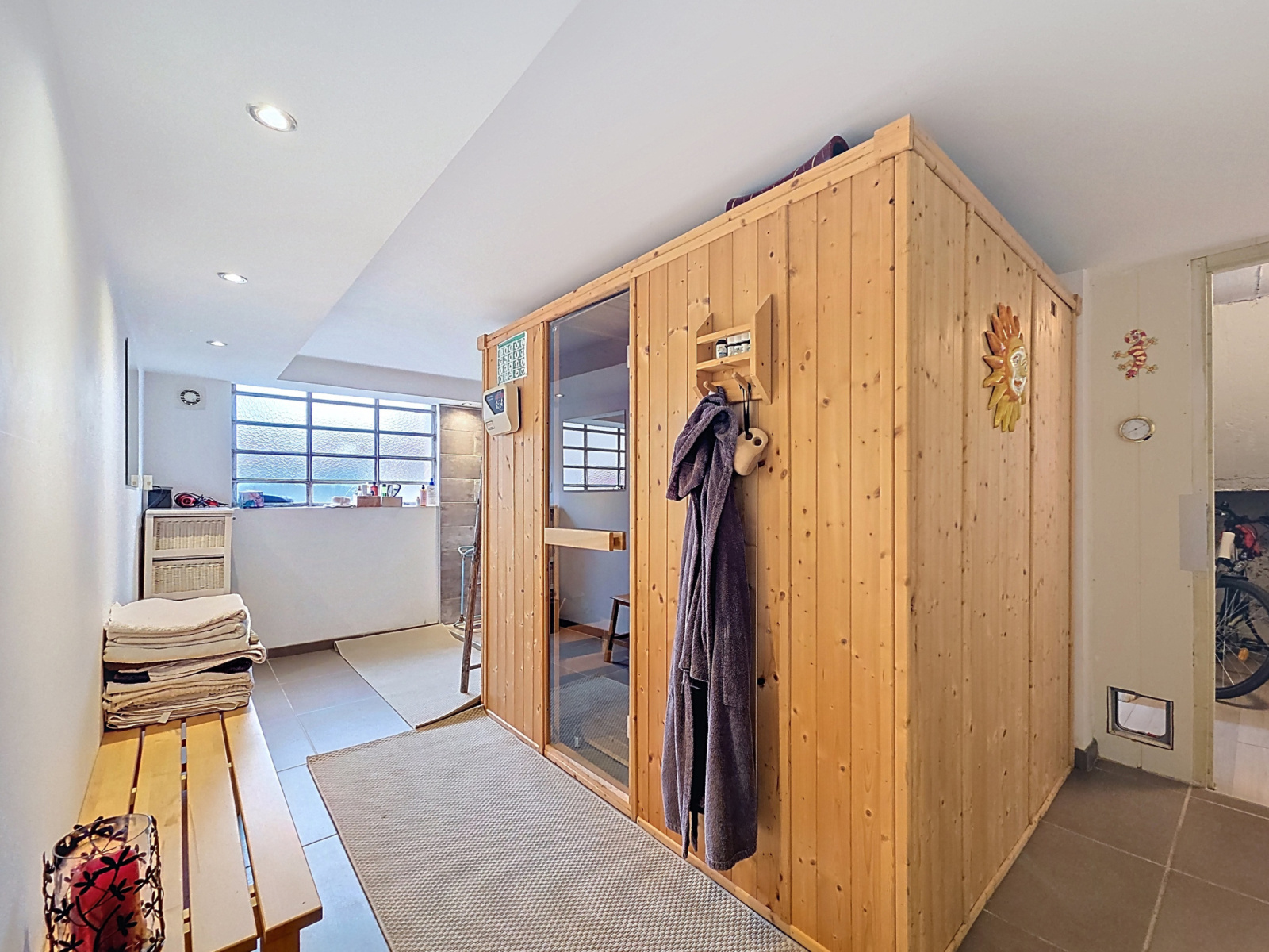 Elle se compose au RDC (hauteur sous plafond de 2m à 2m20) d'une cuisine ouverte sur une grande pièce de vie donnant sur le jardin (pouvant servir de cuisine d'été), une chambre, un espace bien être avec Sauna et douche à l'italienne et un WC séparé. Ce niveau offre une vraie dépendance pour du locatif, ami, famille etc...