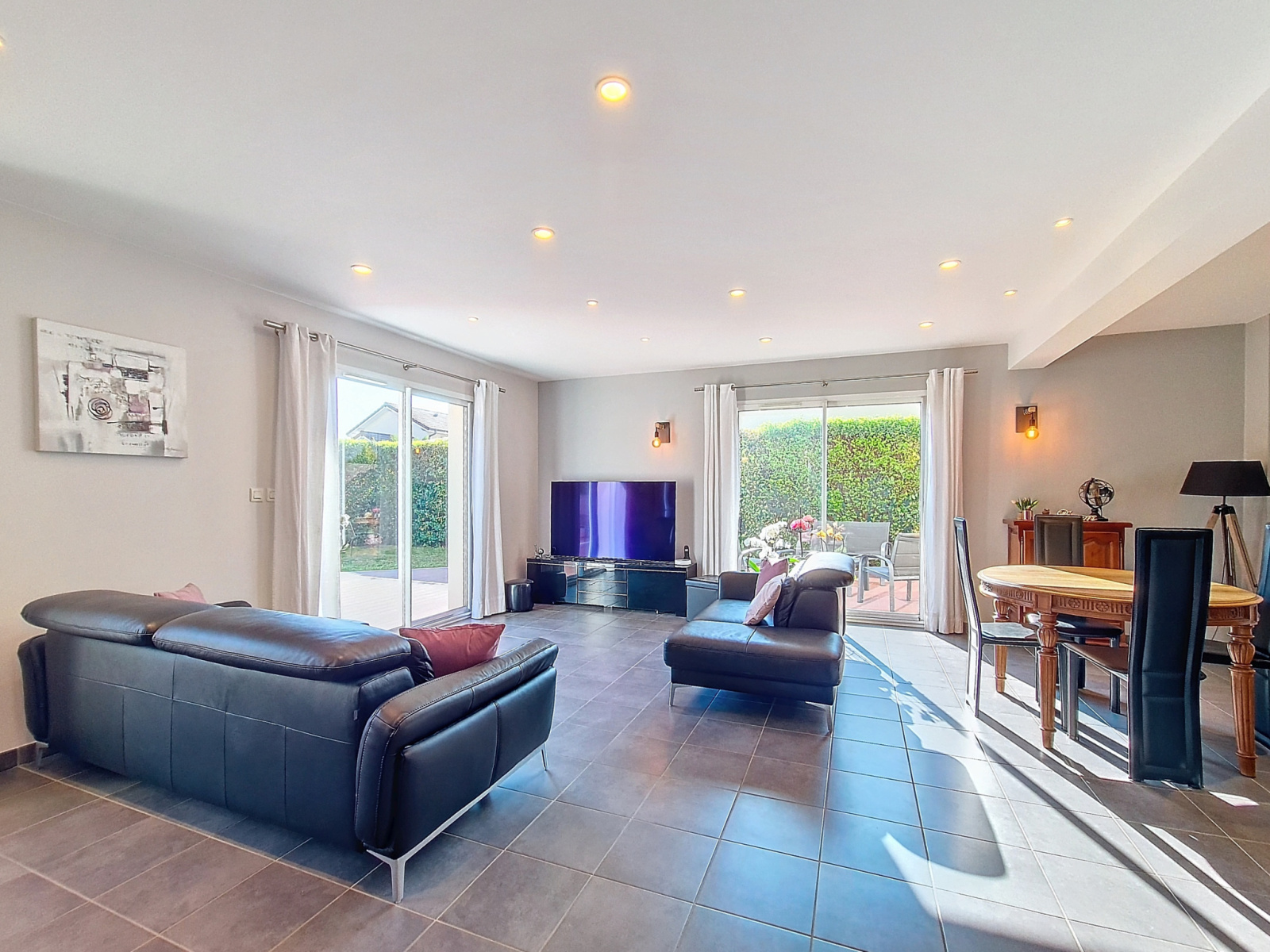 Il se compose au RDC d'un hall d'entrée avec placard donnant sur un vaste séjour-salle à manger-cuisine totalisant 48m², d'un cellier/dressing et d'un wc séparé avec point d'eau.