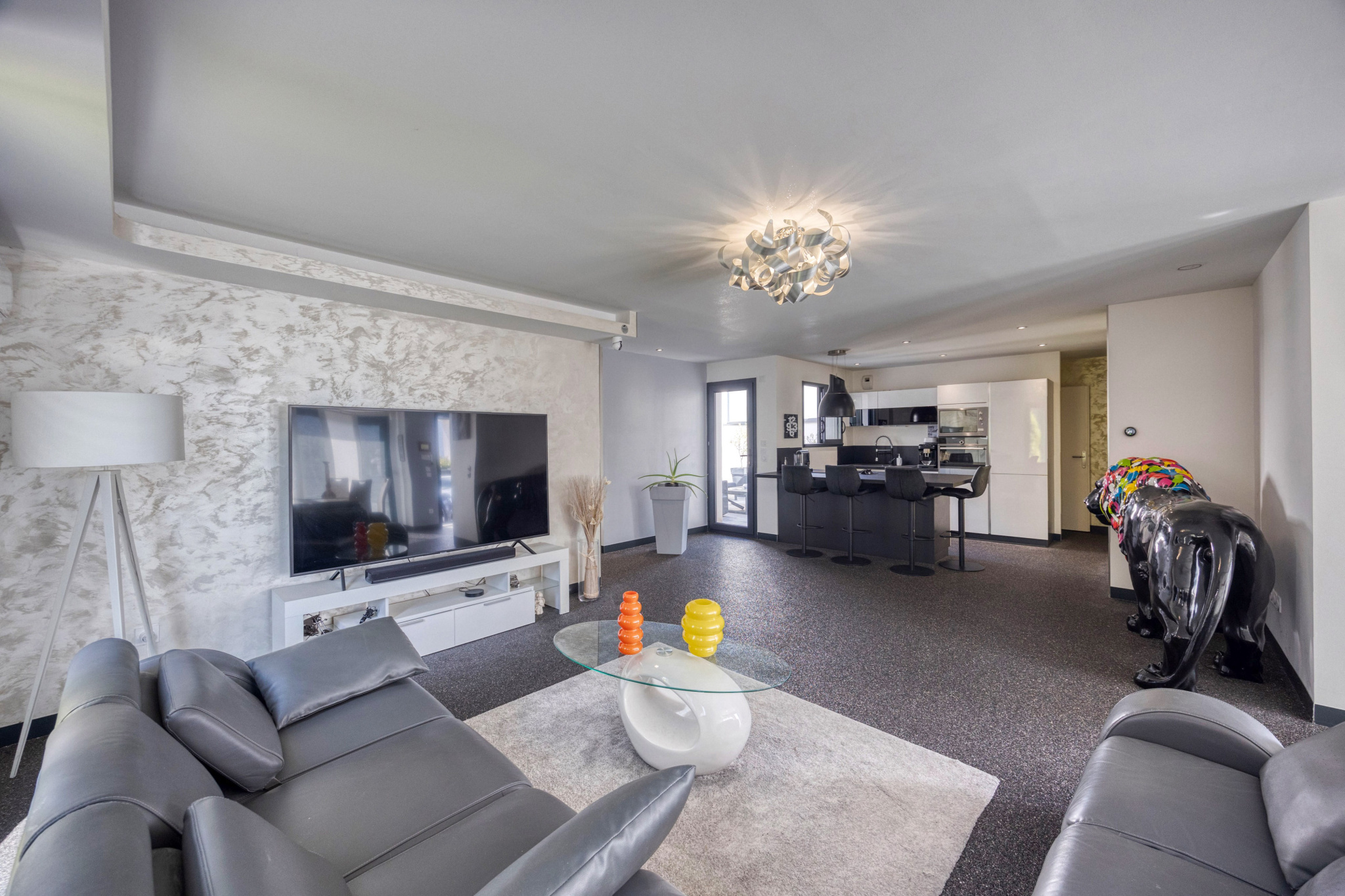 Grande pièce de vie Salon/ Salle à manger / Cuisine de 56m2 permettant d'accéder d'un coté au patio, de l'autre coté au jardin. Bonne expositiion traversante Est/Sud/Ouest.