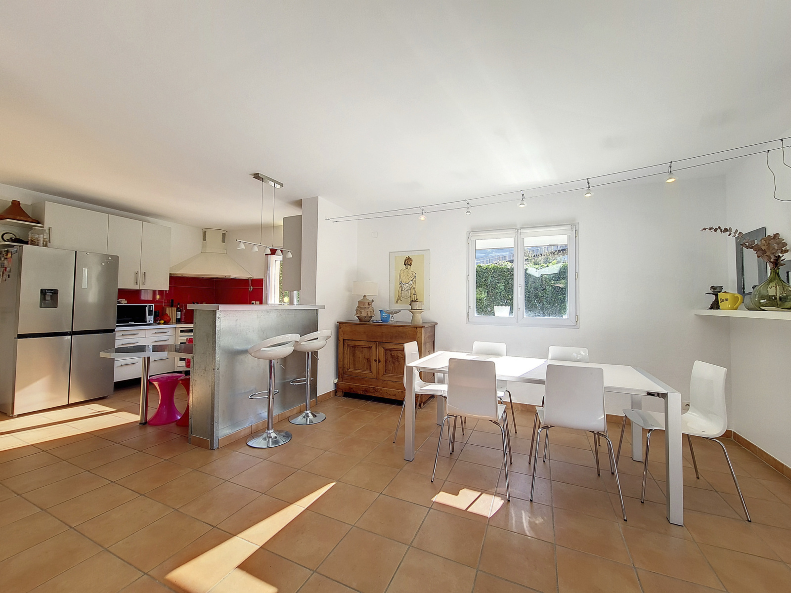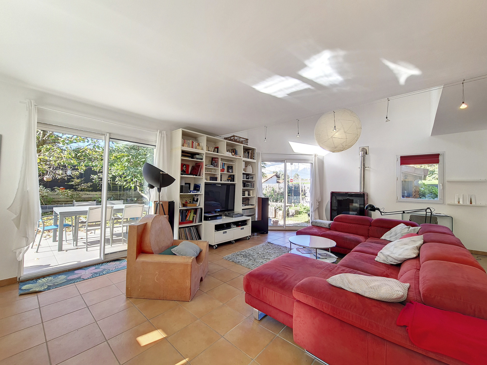 Elle se compose au RDC d'une entrée, d'une cuisine ouverte sur une grande pièce de vie totalisant environ 55m² donnant sur la terrasse de 30m² carrelée, d'un cellier, d'un wc séparé avec point d'eau et de nombreux rangements.