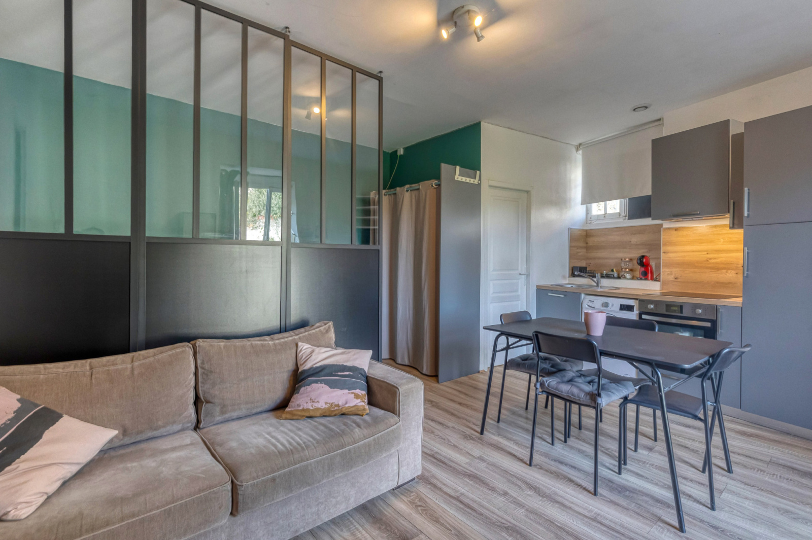 L’annexe de 25 m², entièrement rénovée elle aussi, comprend un salon avec cuisine ouverte, une alcôve « chambre » et une salle d’eau avec WC, permettant d’accueillir famille, amis ou de créer un espace indépendant de travail.