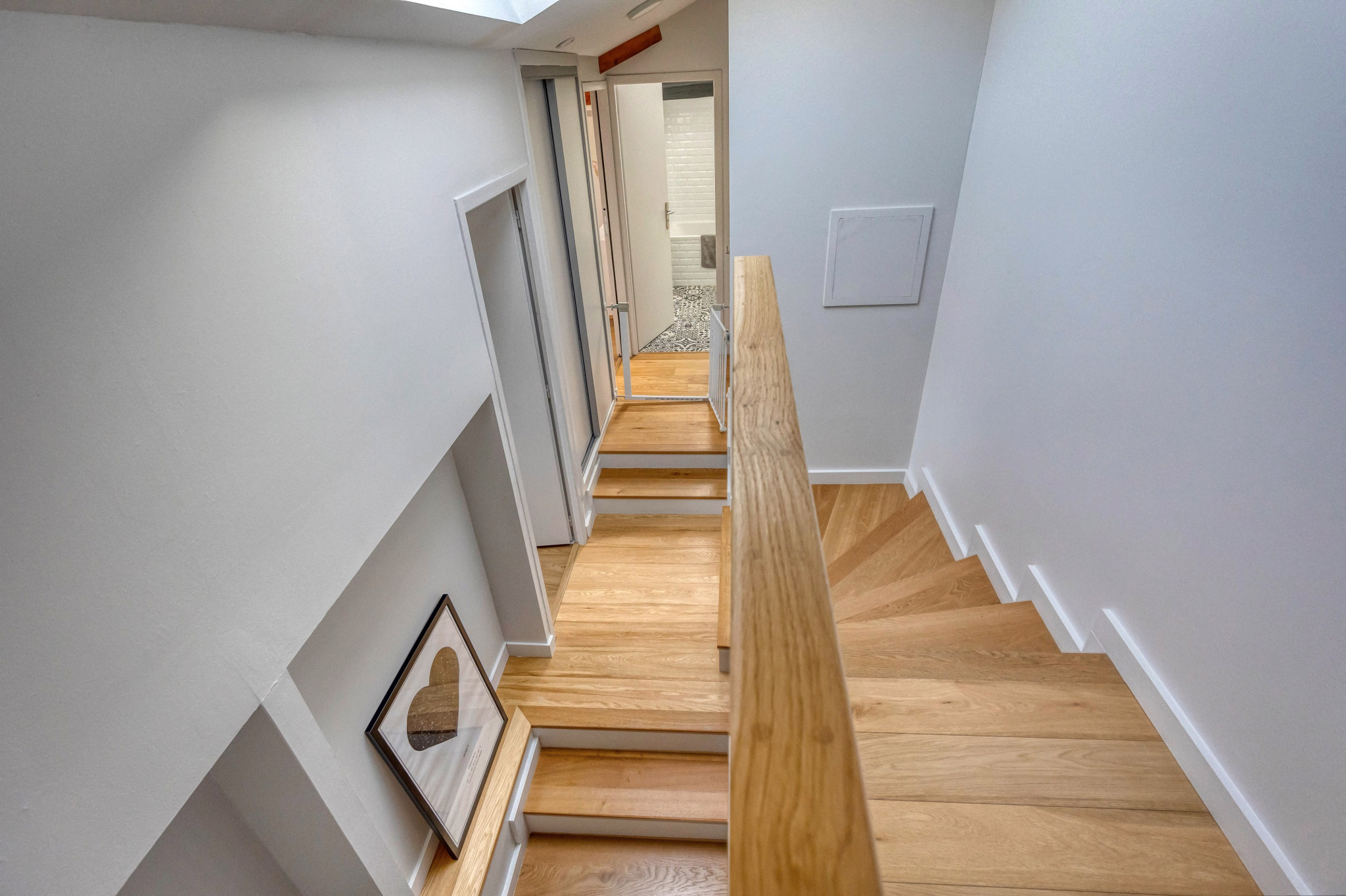 Au rez-de-chaussée, les volumes généreux et le cachet de l’ancien se mêlent à une rénovation contemporaine : une belle pièce de vie lumineuse regroupant salon/séjour et cuisine ouverte, idéale pour profiter d’un espace chaleureux et convivial.
