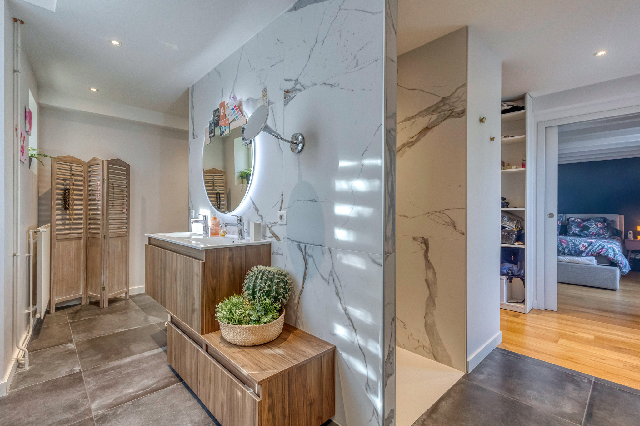À l’étage, la maison offre une suite parentale élégante avec salle d’eau et dressing, ainsi que trois chambres supplémentaires et une salle de bains, alliant charme et confort moderne.