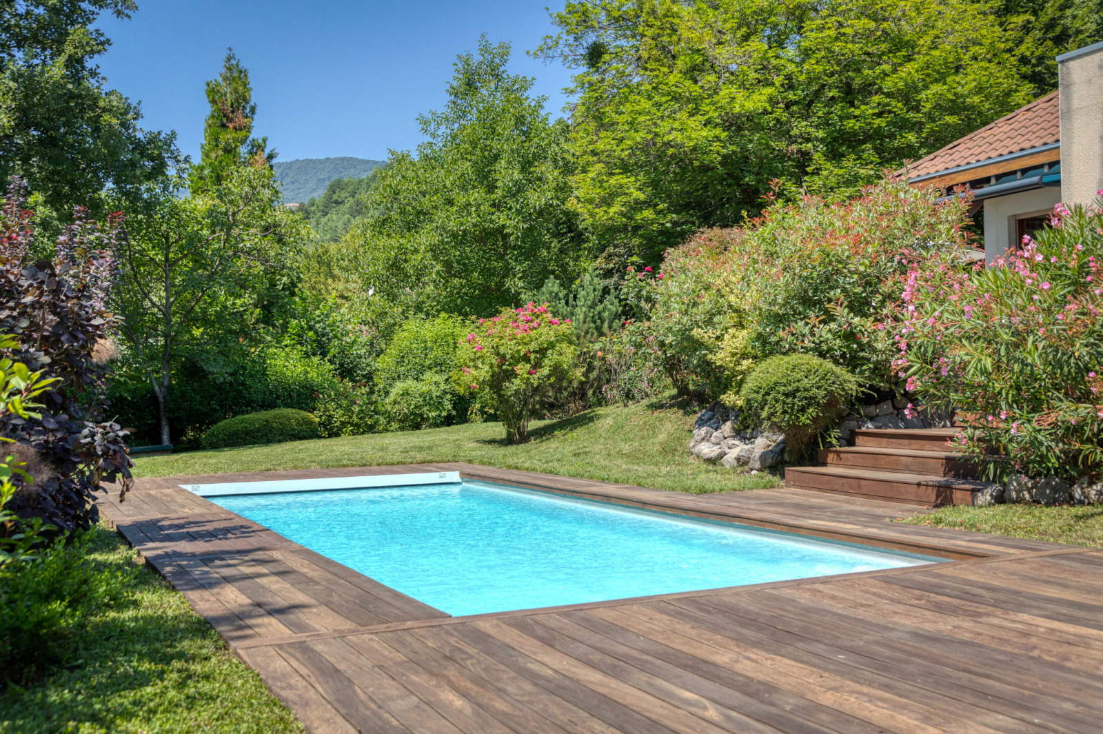 Piscine avec volet roulant intégré - construite en 2015 - PVC Armé / Filtration à sable - Installation domotique Somfy dans toute la maison.