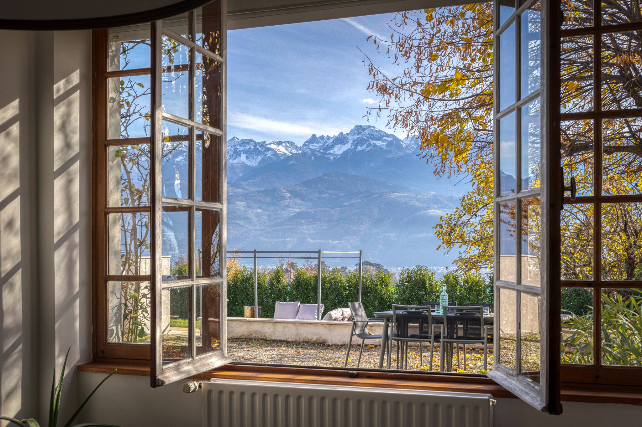 À l’extérieur, vous bénéficierez d’un vaste jardin arboré et d’une piscine , le tout sublimé par une vue panoramique exceptionnelle sur le massif de Belledonne.