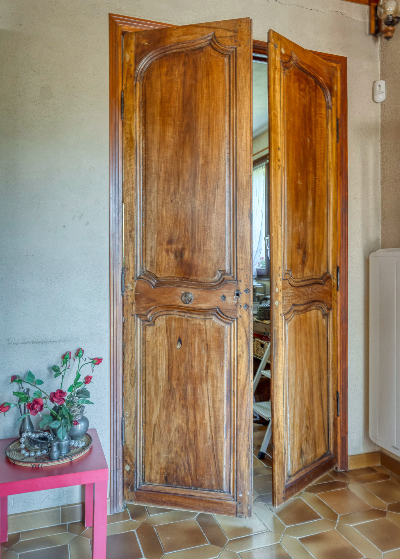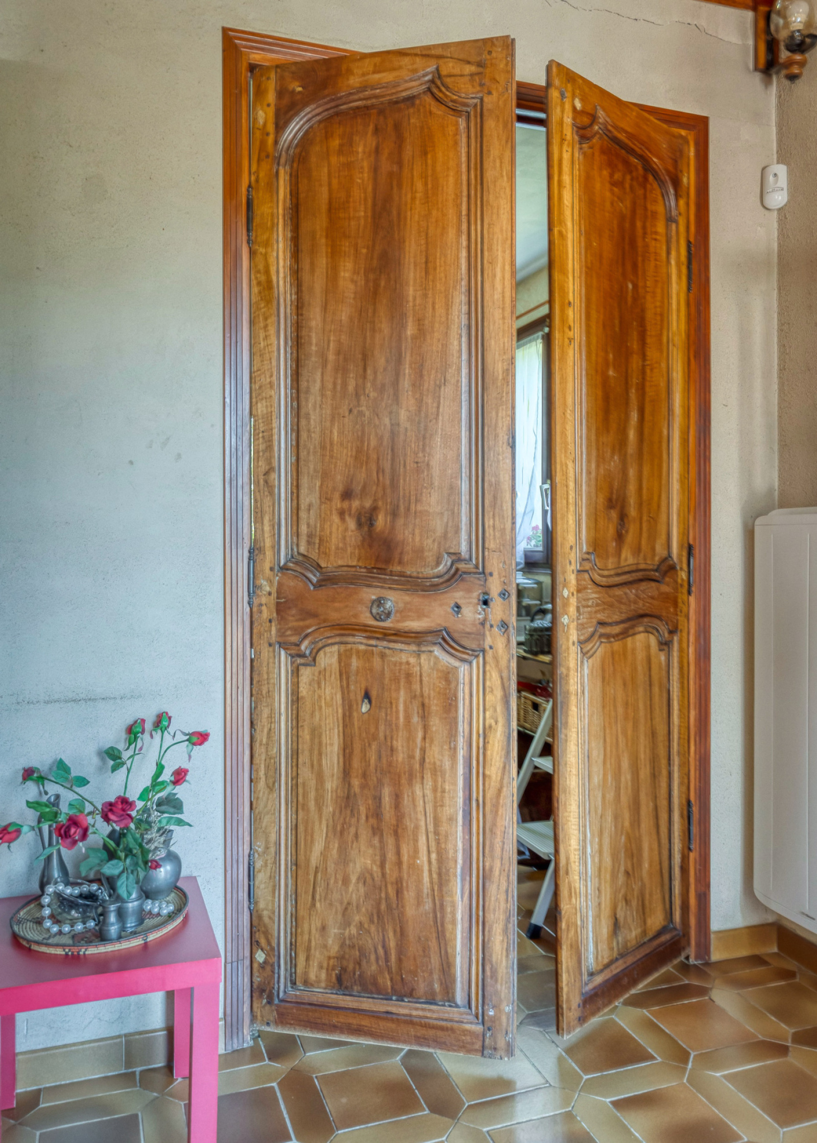 Sa cuisine séparée avec ses portes palières en Noyer. Sa suite parentale sublimée toujours par le cachet de l'ancien avec aussi de belles portes palières menant directement à la salle d'eau ( douche a l'italienne avec 2 vasques ) et une intendance avec machine a laver , rangements.