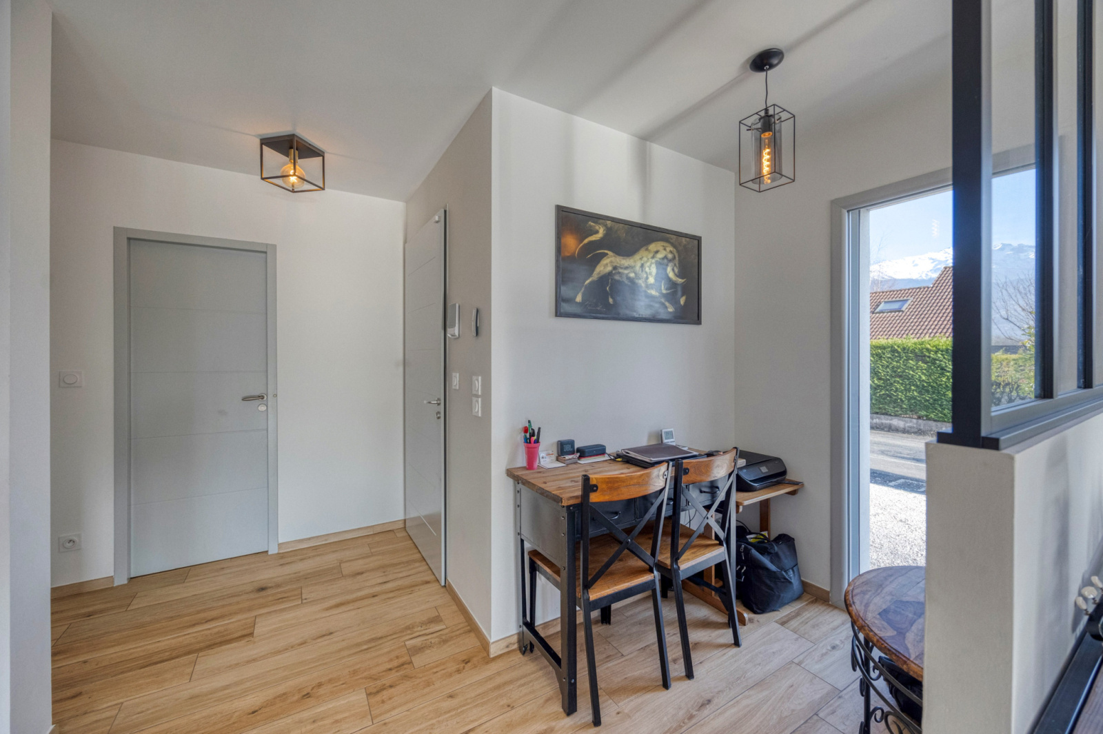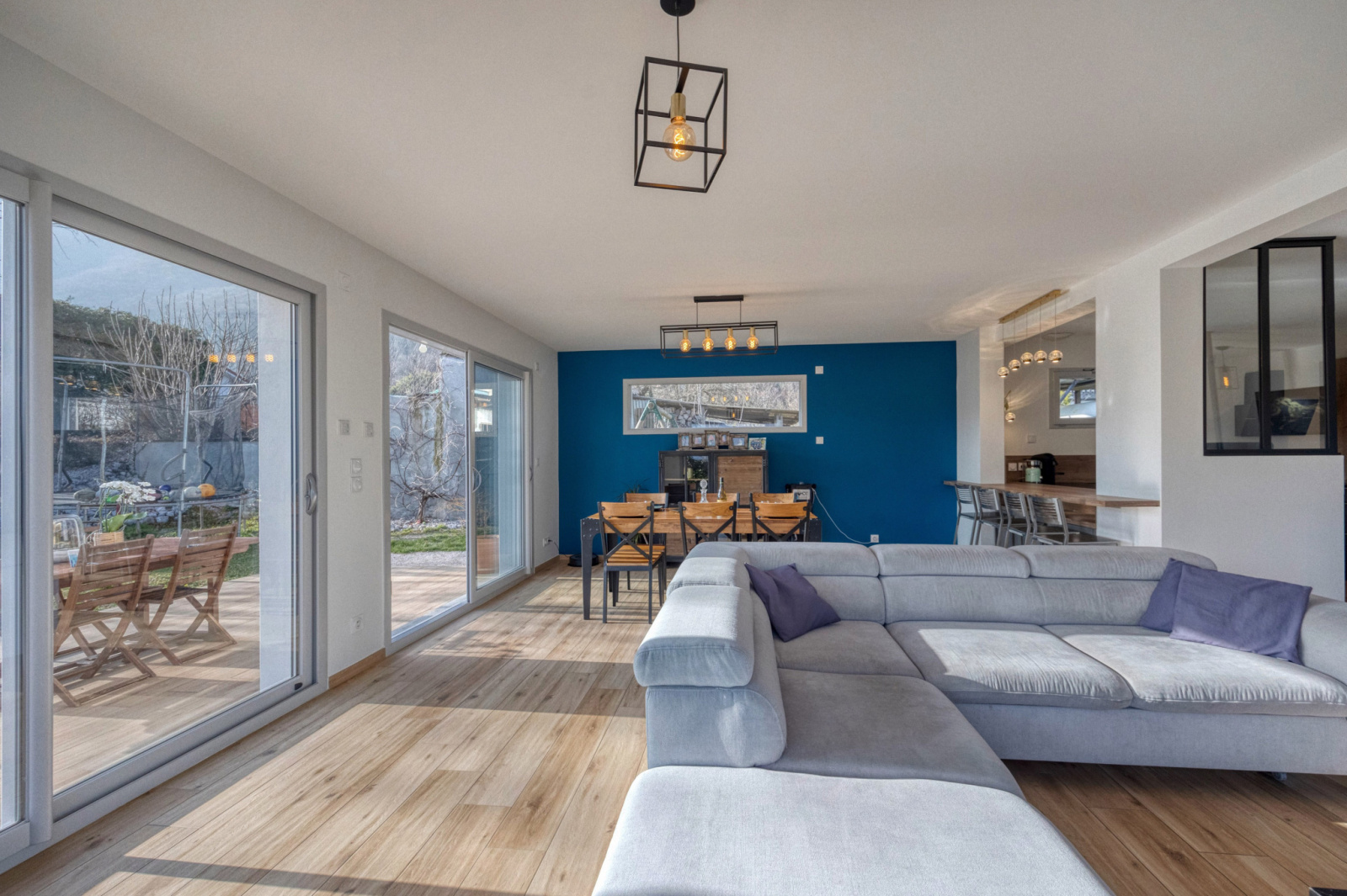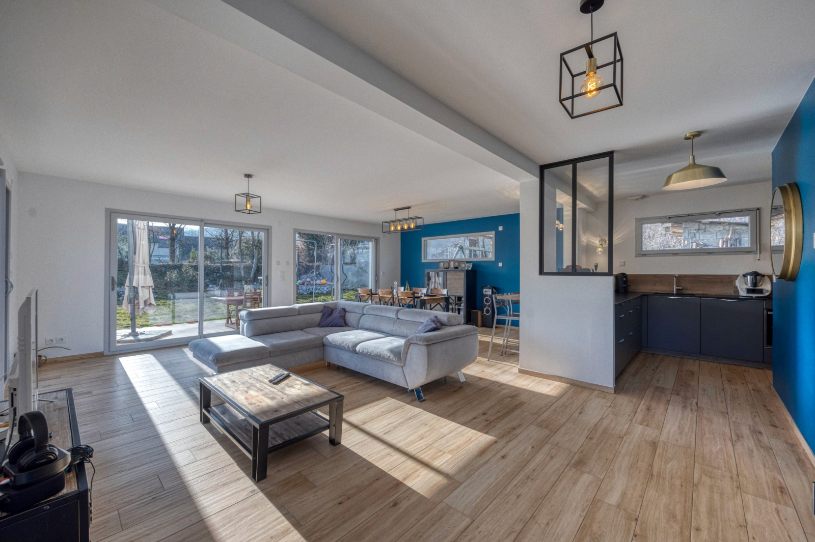 En rez de jardin, un hall d'entrée avec un coin bureau séparé par une verrière -grande pièce de vie 62m2 avec une cuisine ouverte de qualité (plan de travail en granit) et un accès direct à la buanderie/cellier depuis la cuisine.