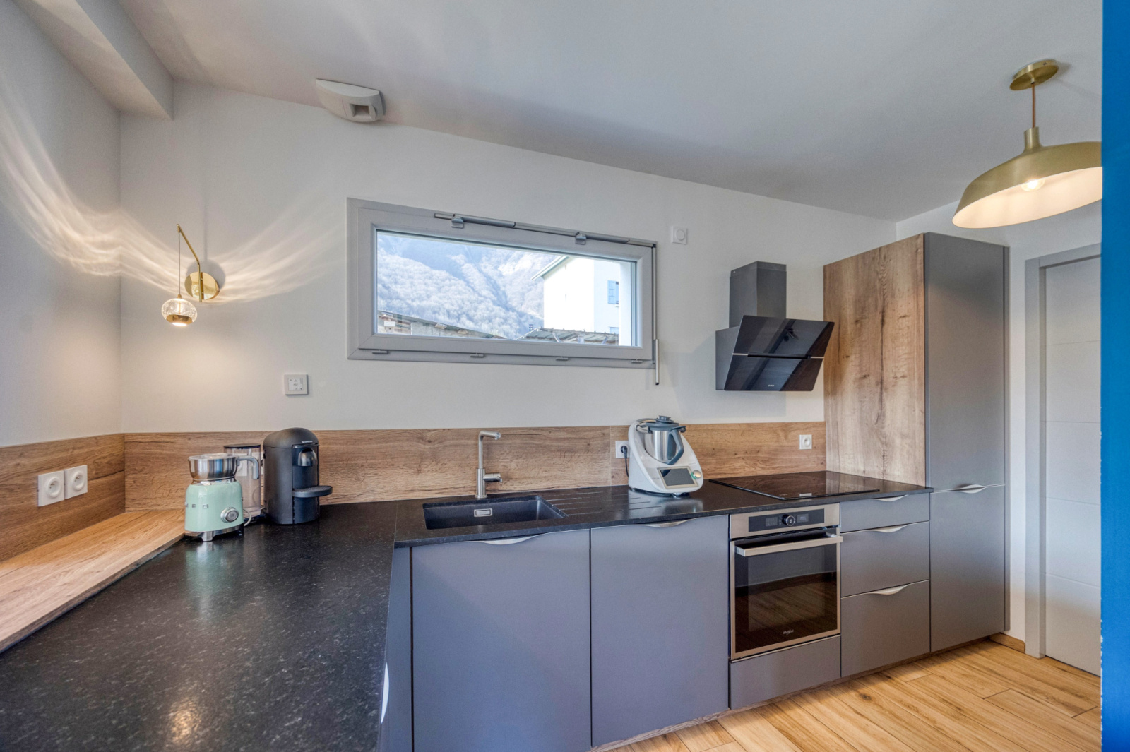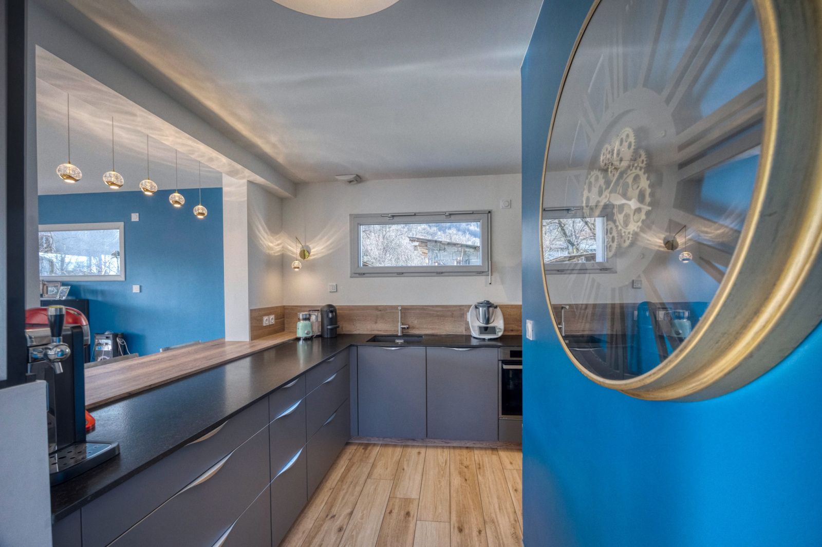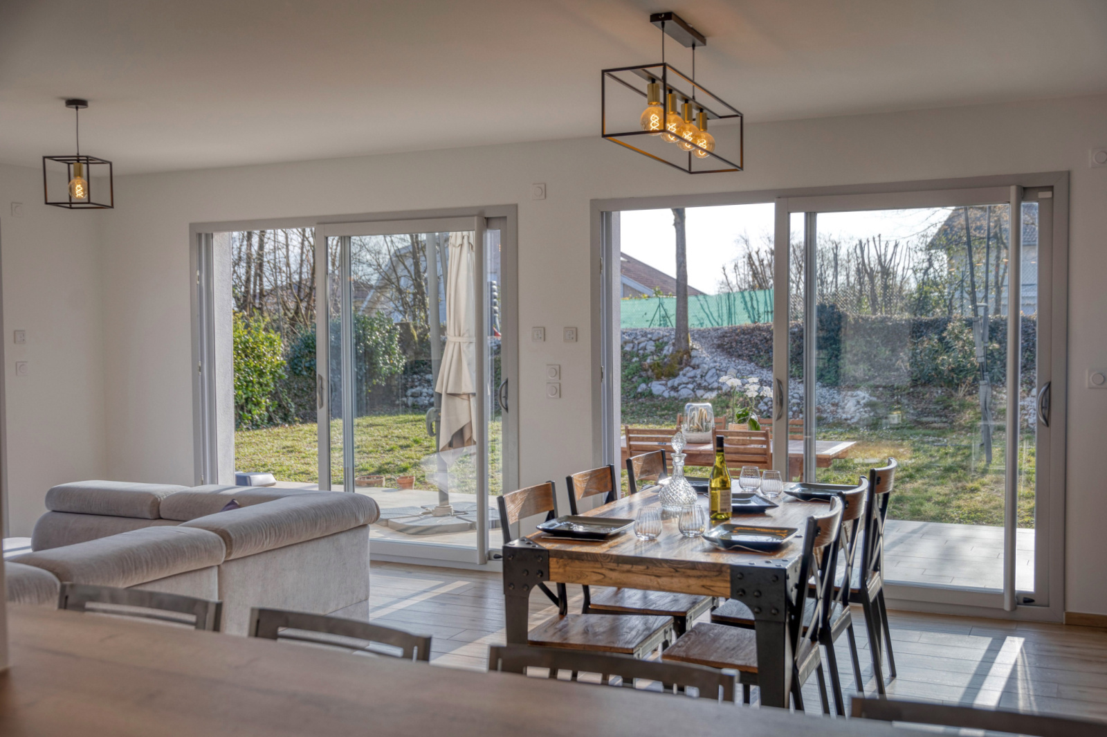 En rez de jardin, un hall d'entrée avec un coin bureau séparé par une verrière -grande pièce de vie 62m2 avec une cuisine ouverte de qualité (plan de travail en granit) et un accès direct à la buanderie/cellier depuis la cuisine.
