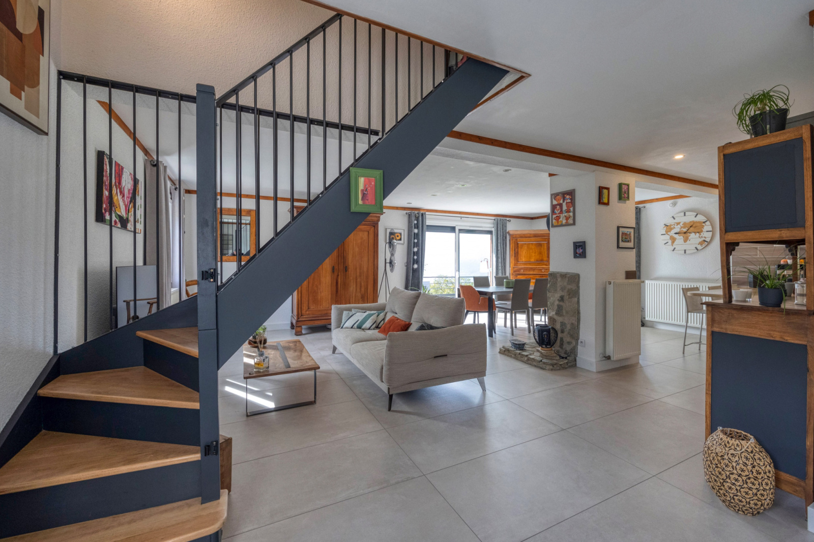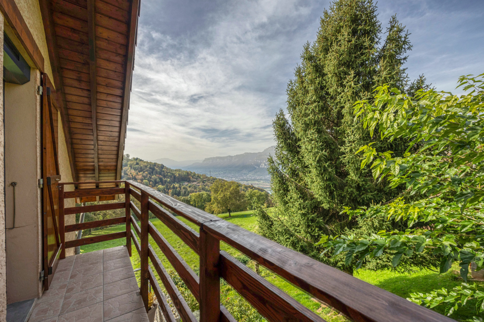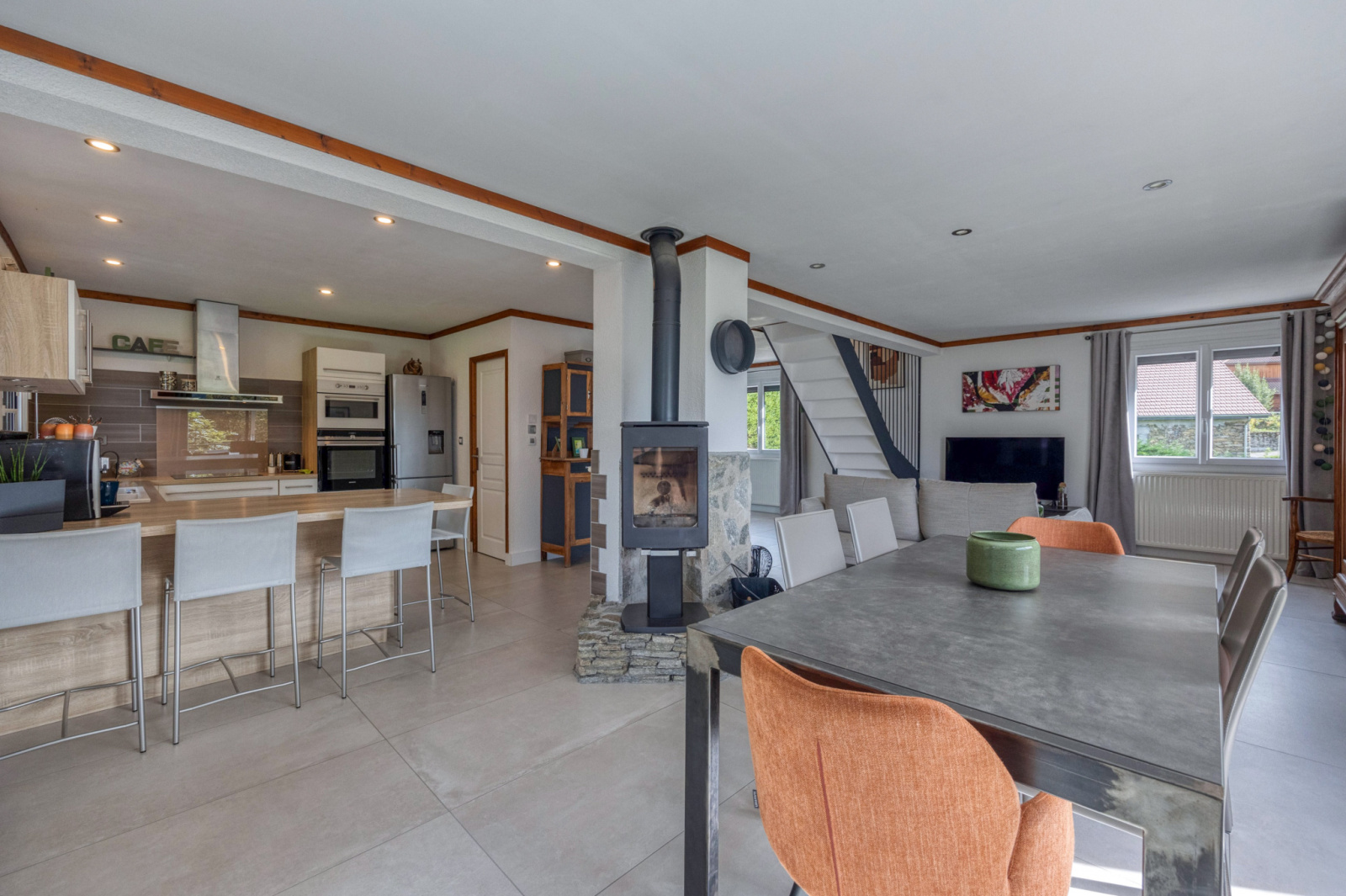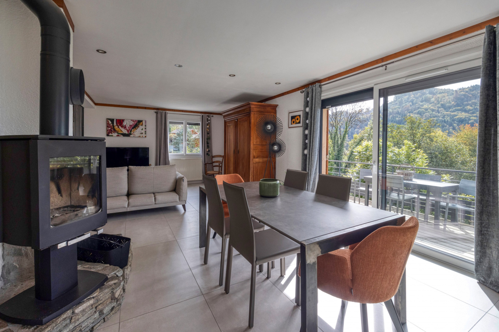 En rez de jardin un grand salon de 50m2 ouvert sur la cuisine et donnant sur des terrasses Plein SUD avec Vue sur la vallée du Grésivaudan et Grenoble.
