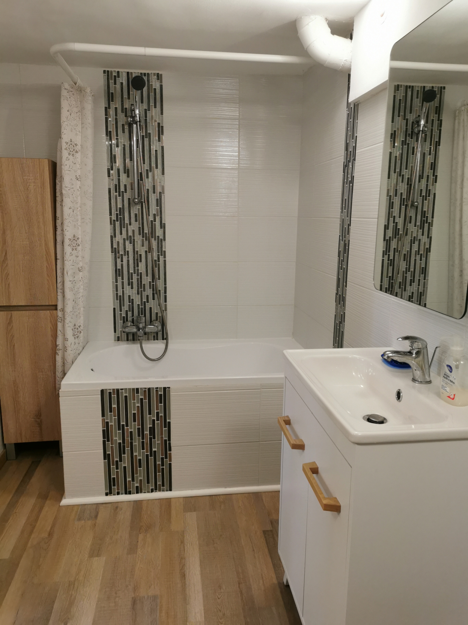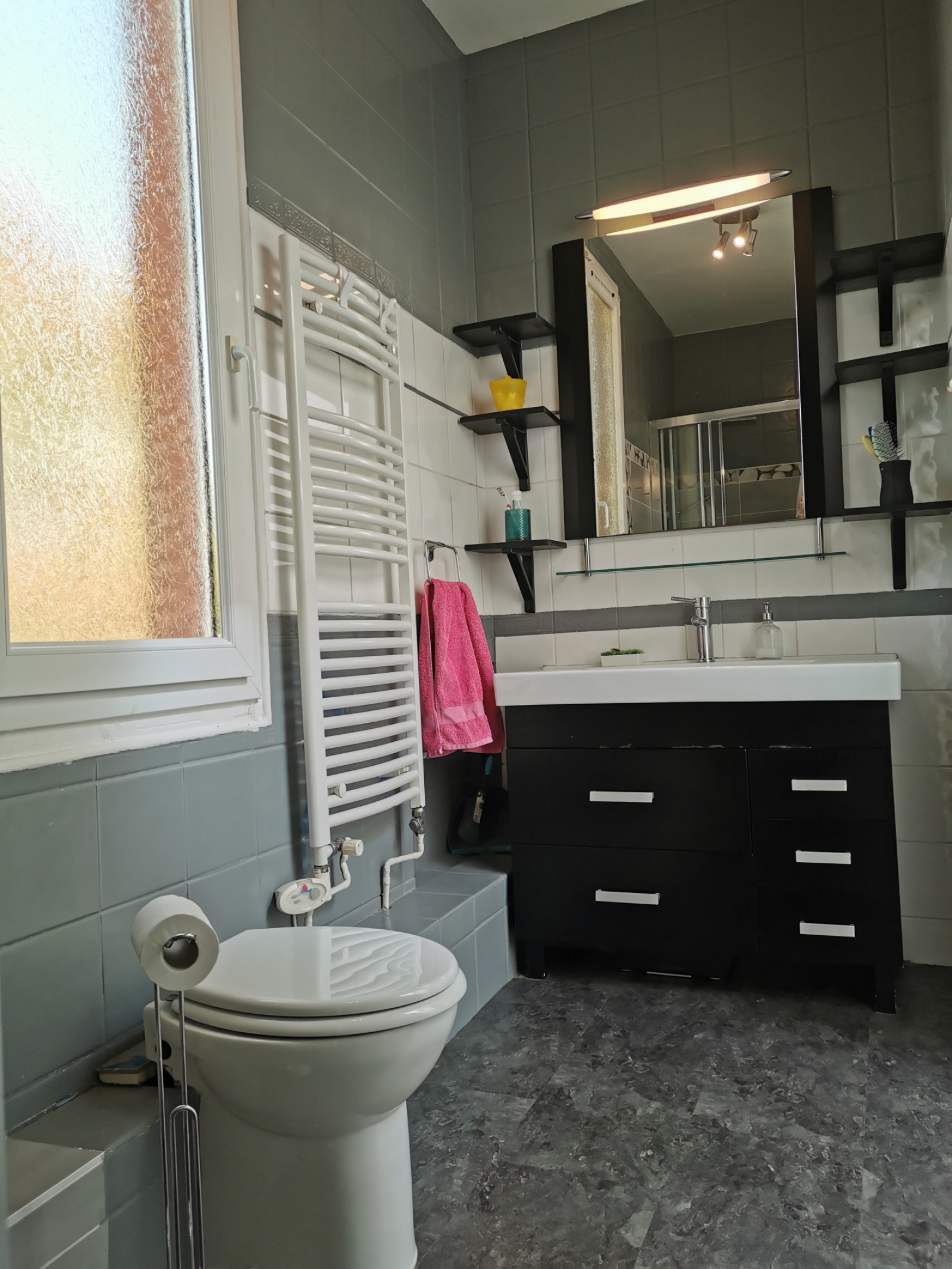 - 1er étage : 2 grandes chambres de 14m2 avec climatisation réversible et placard + 1 salle de bain avec toilette. -