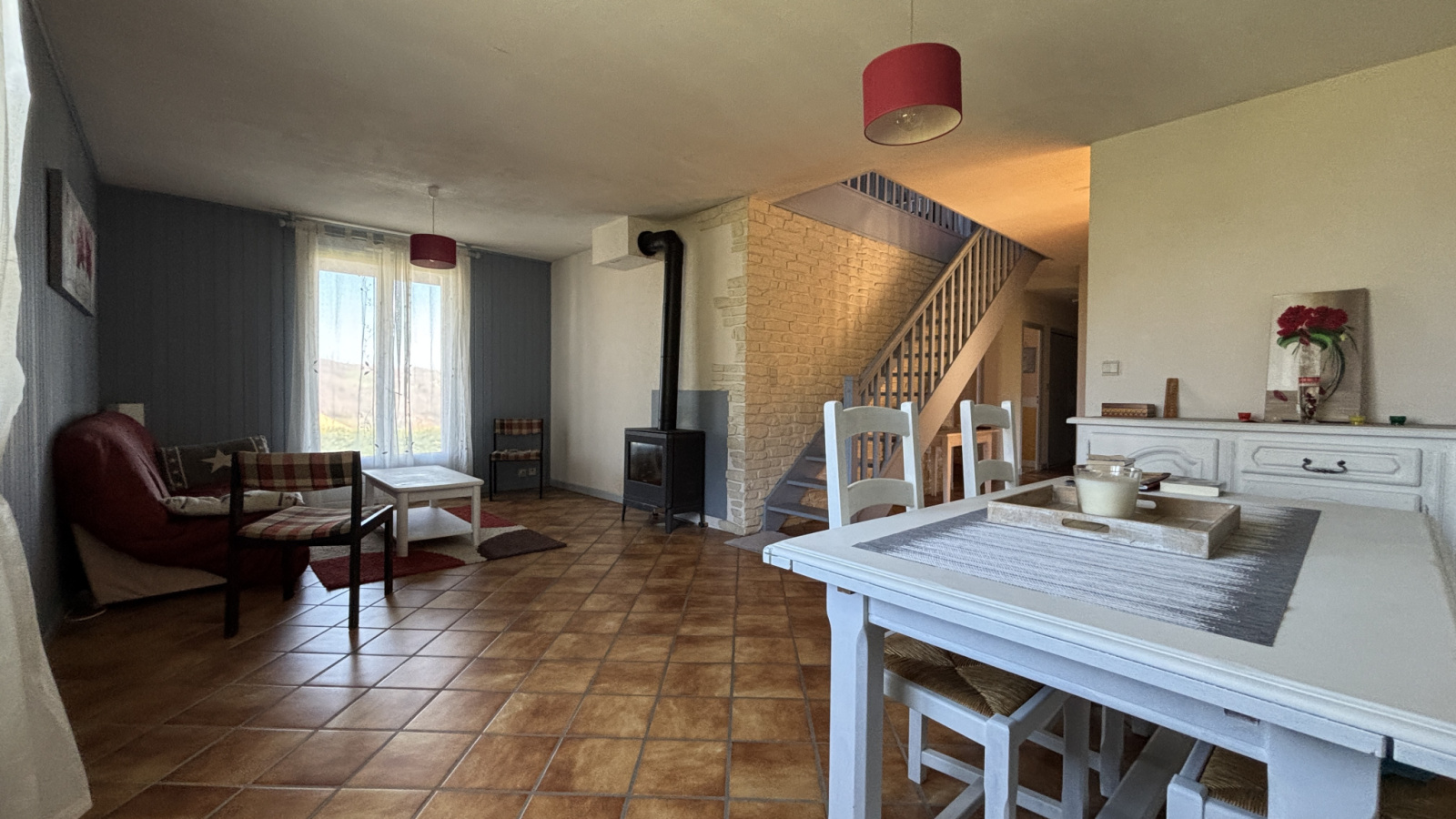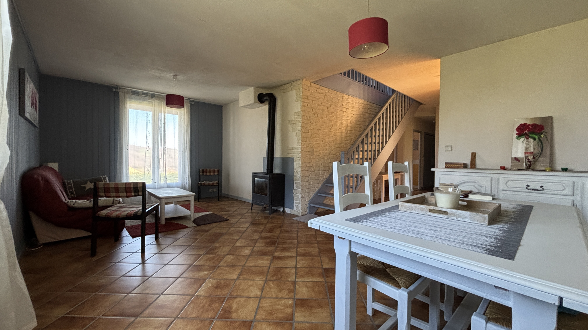 La maison propose un bel espace de vie lumineux au rez-de-chaussée avec salon salle à manger et son poële à bois, ouvrant sur une grande terrasse idéale pour profiter.