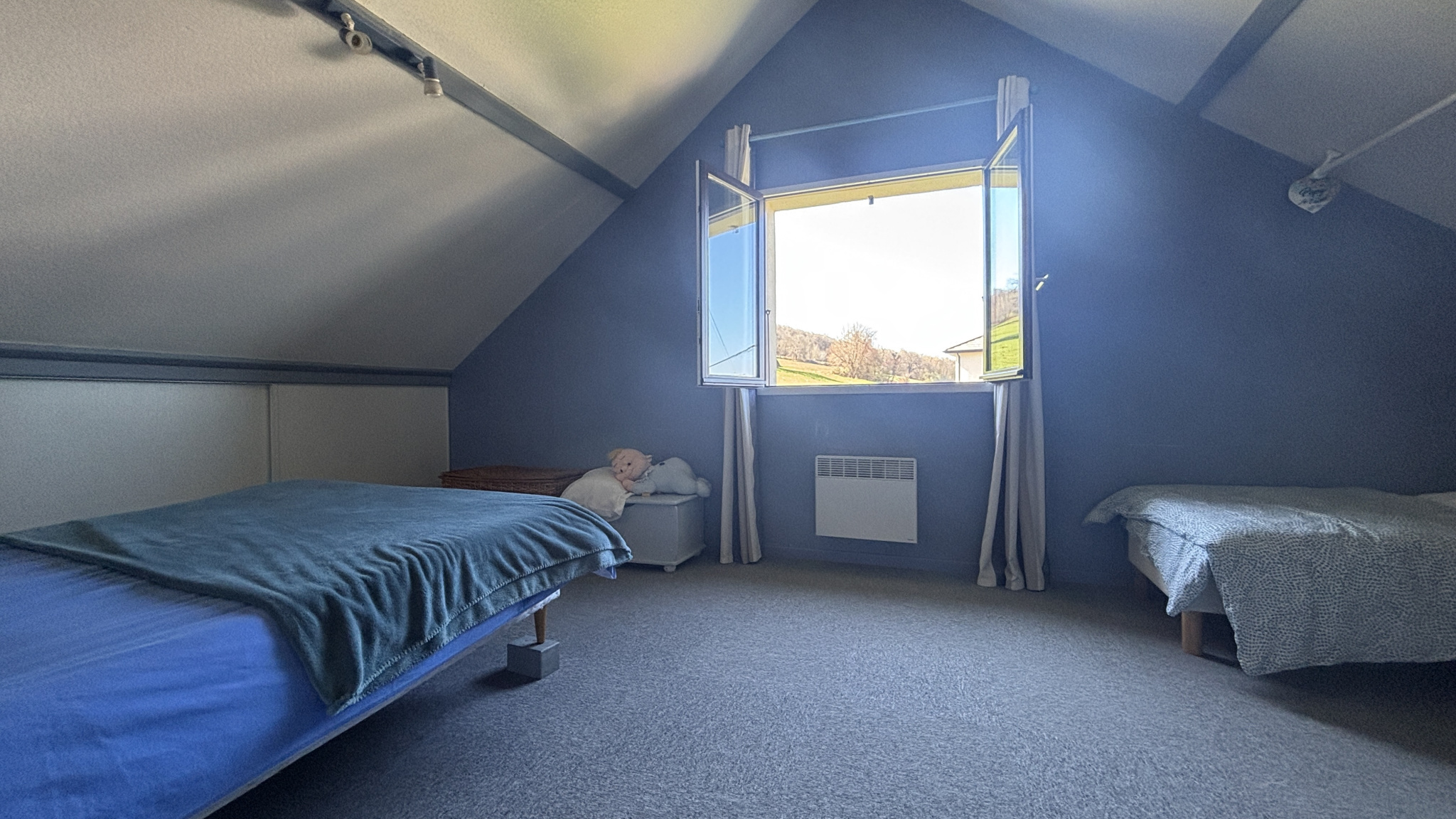 A l'étage, vous découvrirez un espace salon bureau, une chambre, une salle d'eau avec WC, 2 greniers offrant un bel espace de stockage.