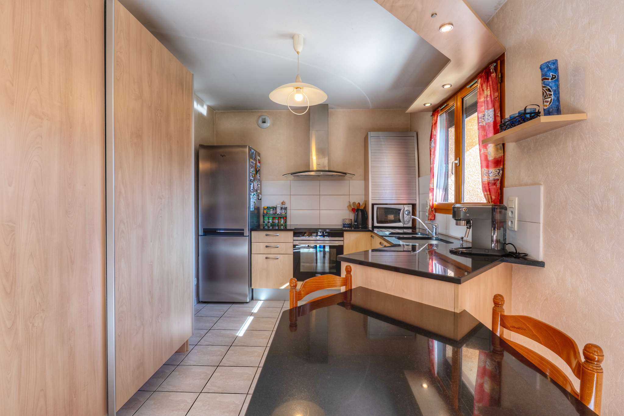 Elle se compose, au rez-de-chaussée, d’un hall d’entrée avec placards, d’une cuisine équipée semi-ouverte sur une pièce de vie totalisant près de 50 m², donnant sur le jardin et la terrasse.