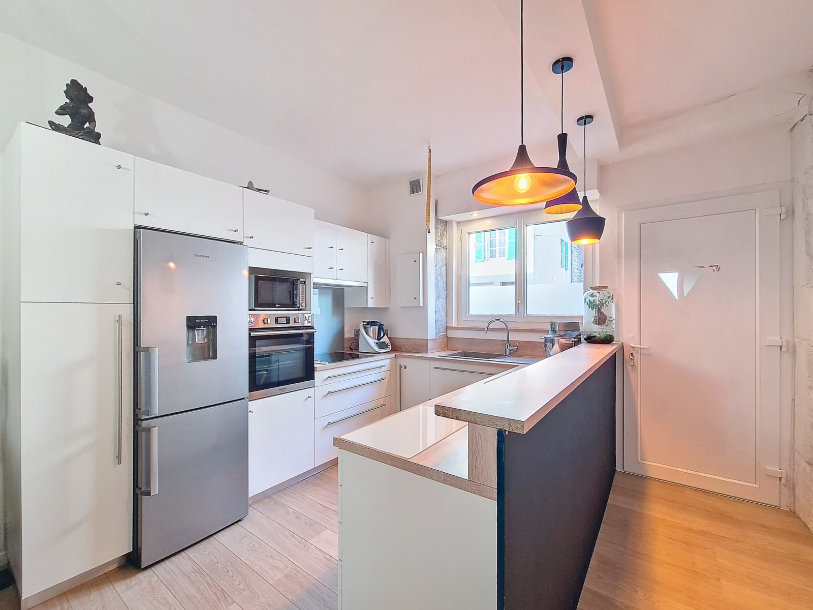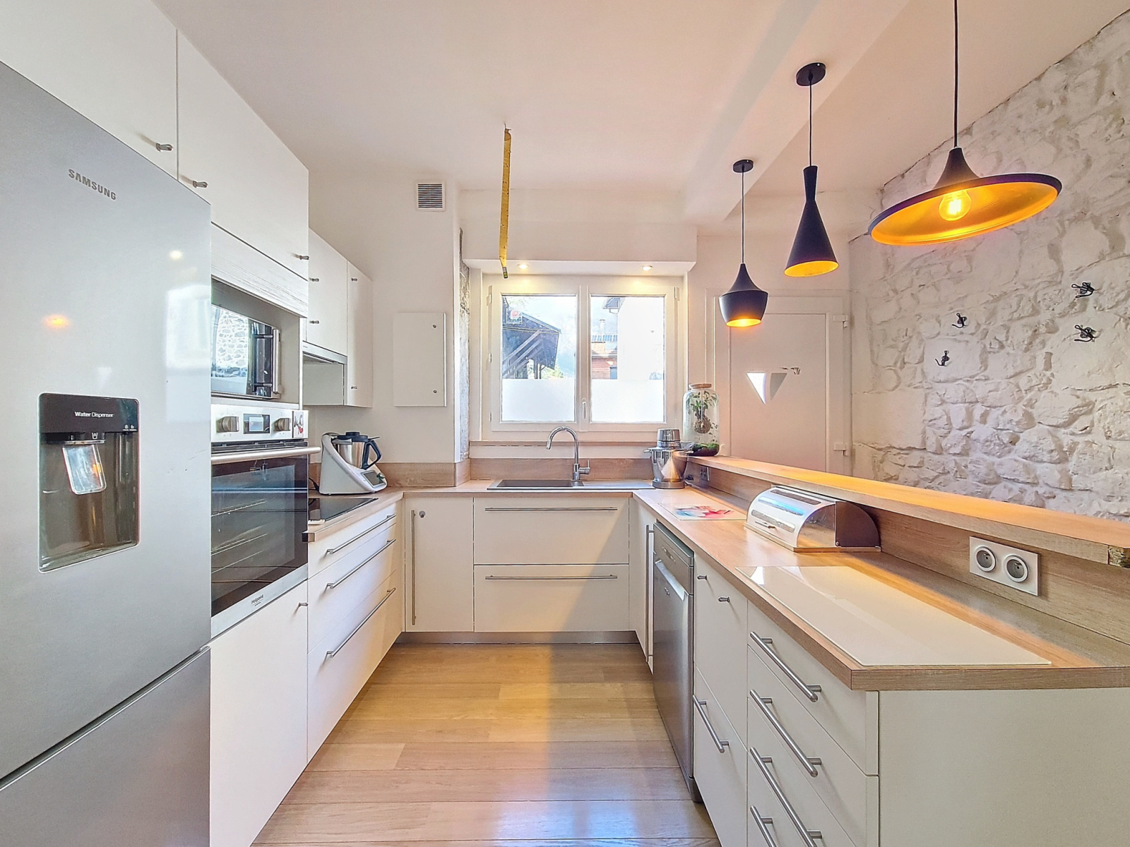 Bénéficiant de 2 accès, un coté route et un coté cours, elle se compose au RDC (accés coté route) d'une cuisine équipée ouverte sur la salle à manger + séjour donnant sur un balcon. Au R-1 (accès coté cours) vous retrouverez une entrée + buanderie de 14m².