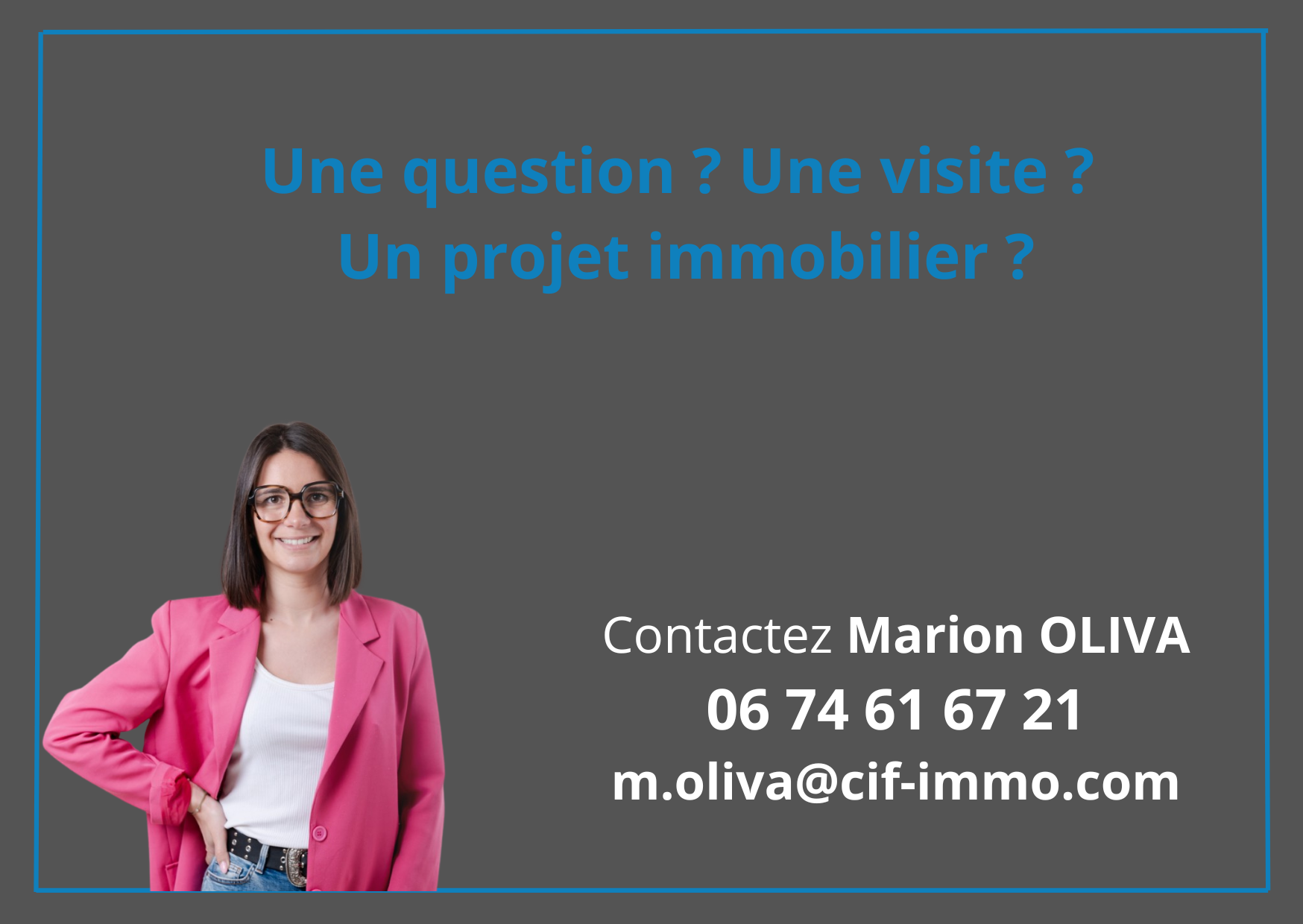 Pour plus d'informations, contactez Marion OLIVA au O674616721 ou par mail m.oliva@cif-immo.com