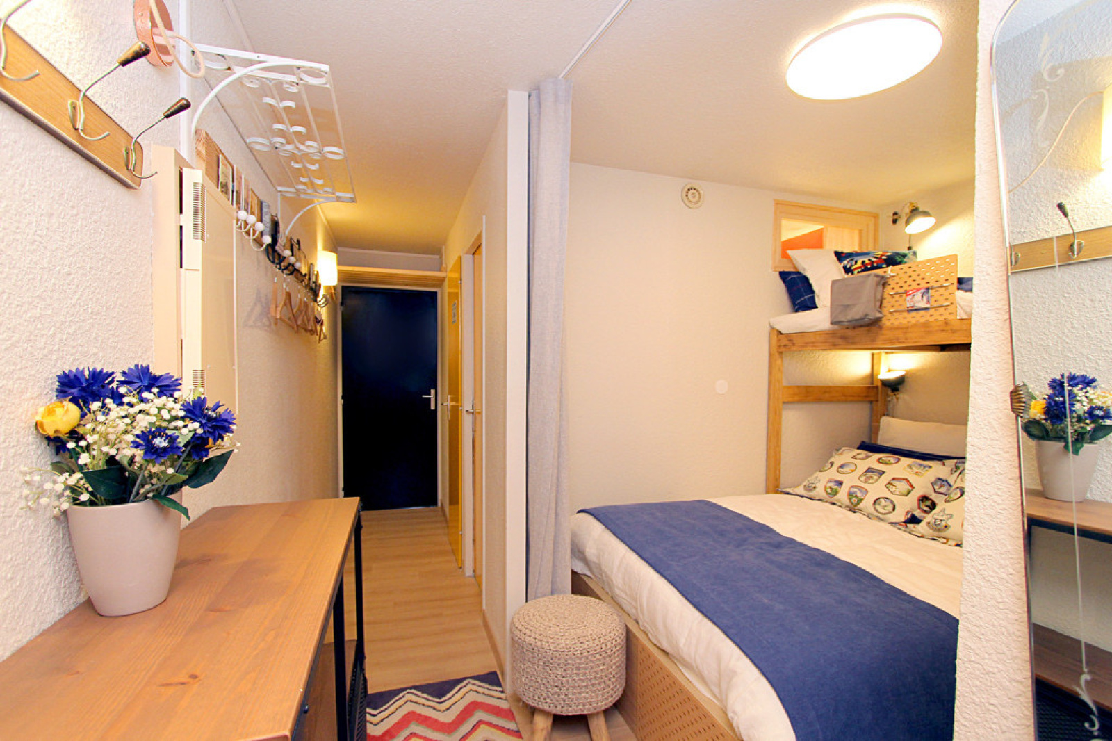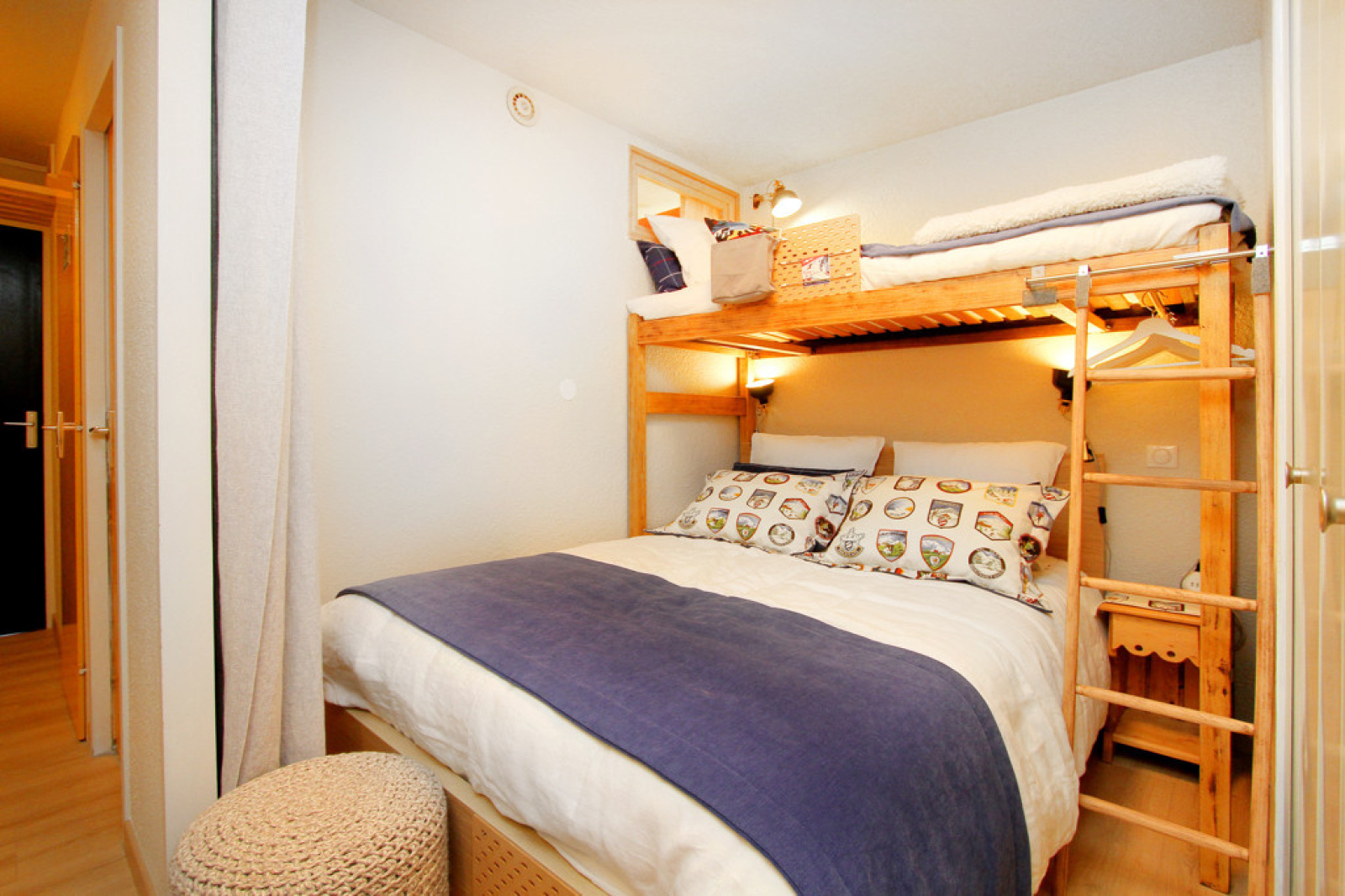A l’entrée, coin nuit séparé du salon avec une porte comprenant un lit en 2 personnes (140x190cm) et un lit superposé 1 personne (90x200cm).