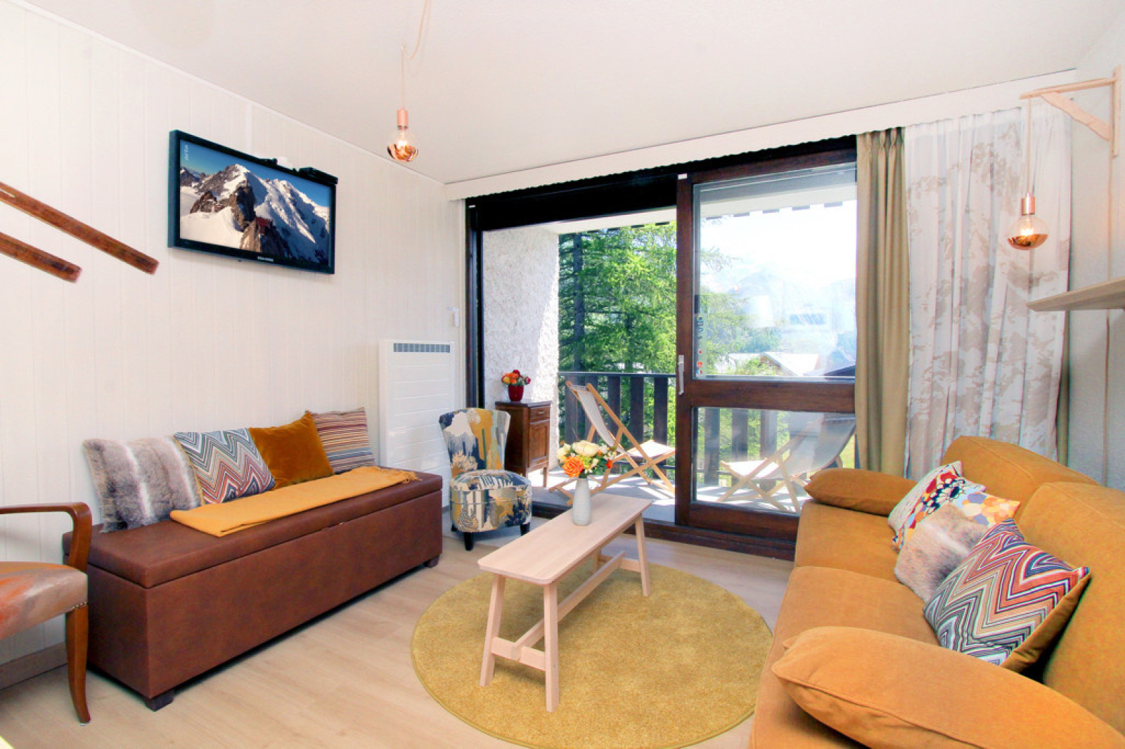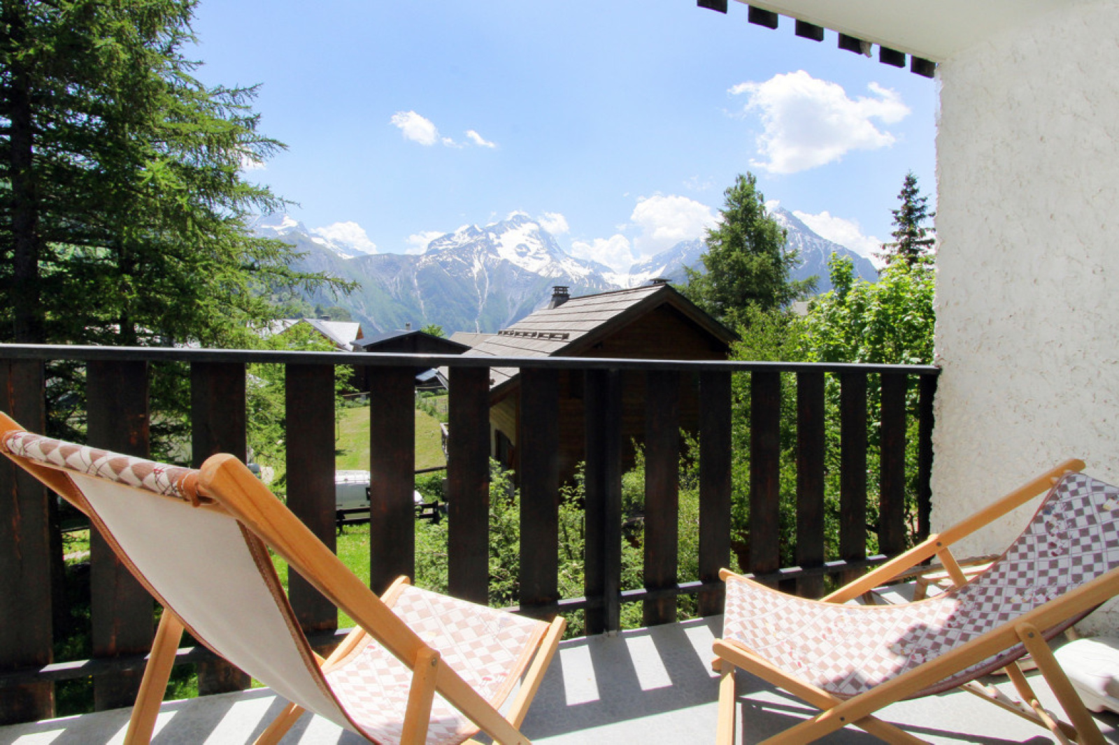 Terrasse couverte exposée Plein Sud - L’appartement est vendu avec 2 locaux à ski, une cave et un accès à un parking privé en extérieur.