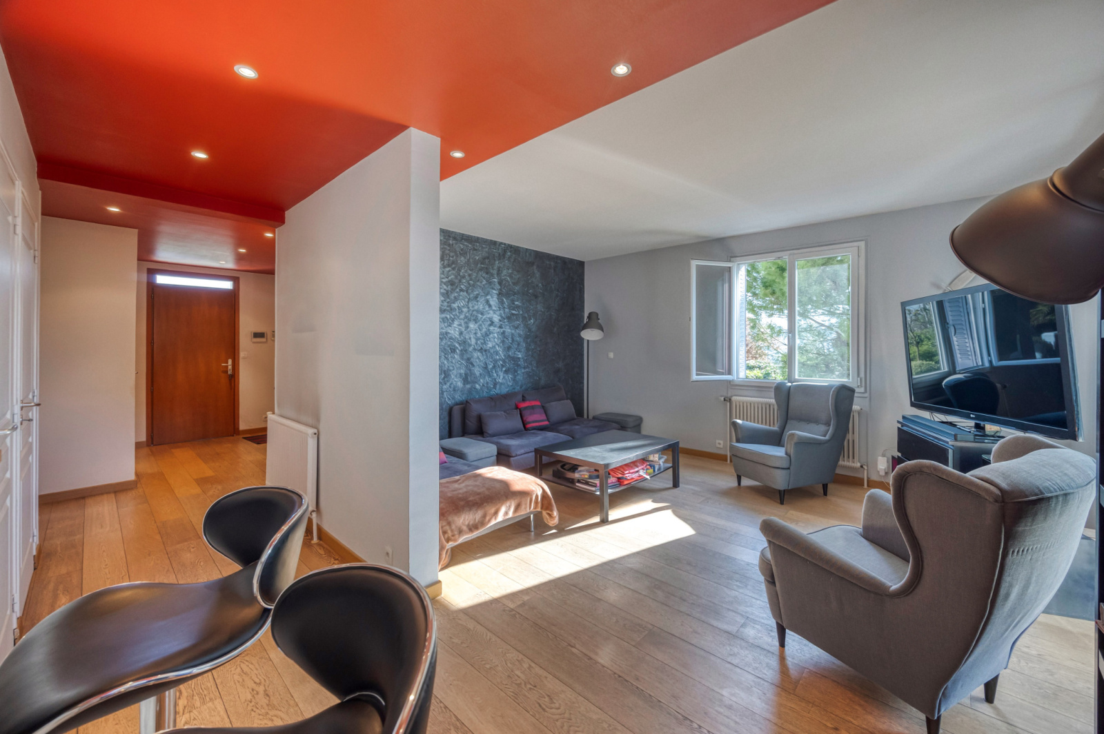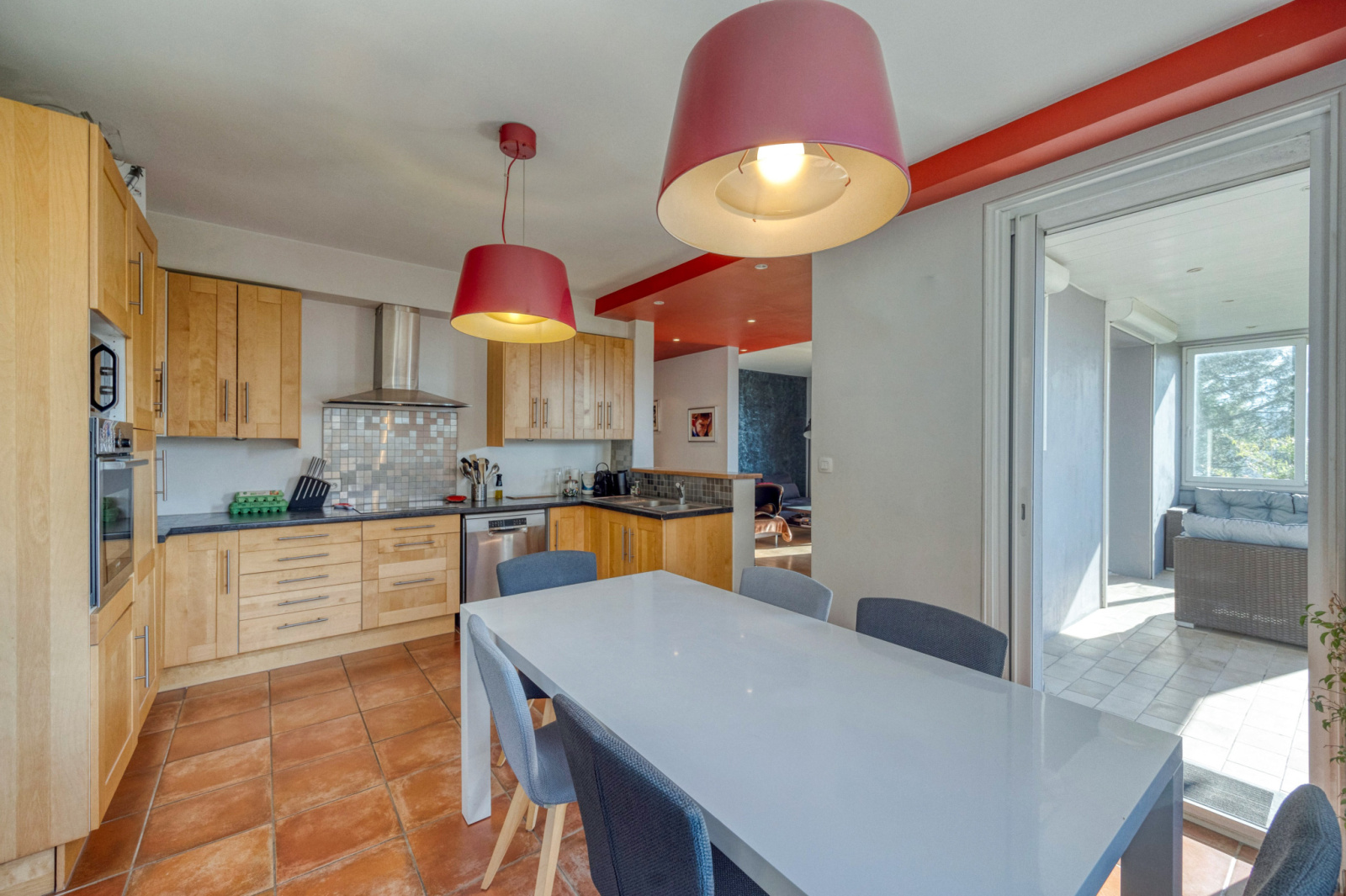 En rez de jardin surelevé vous trouverez un salon, une cuisine ouverte avec un accès au grand jardin par des baies vitrées à galandages. Un bureau (ou chambre) ainsi qu'une suite parentale avec dressing et salle d'eau viennent compléter ce niveau