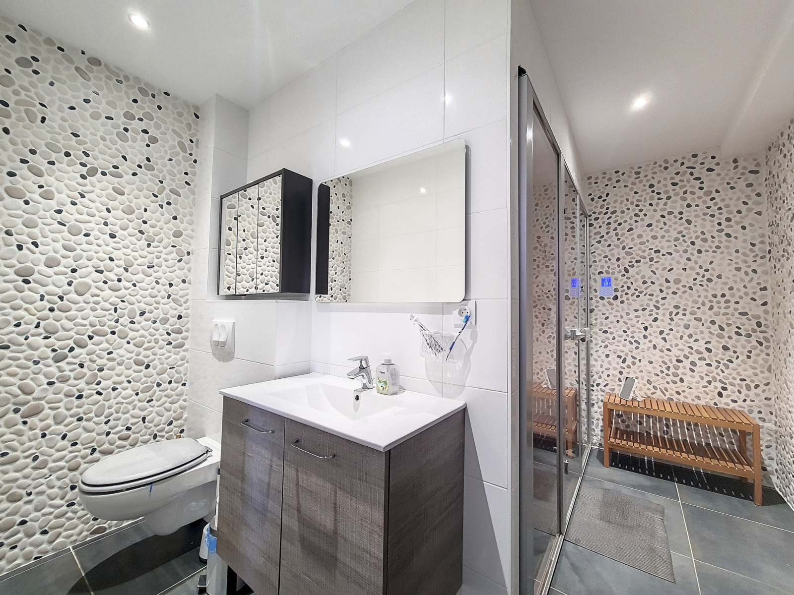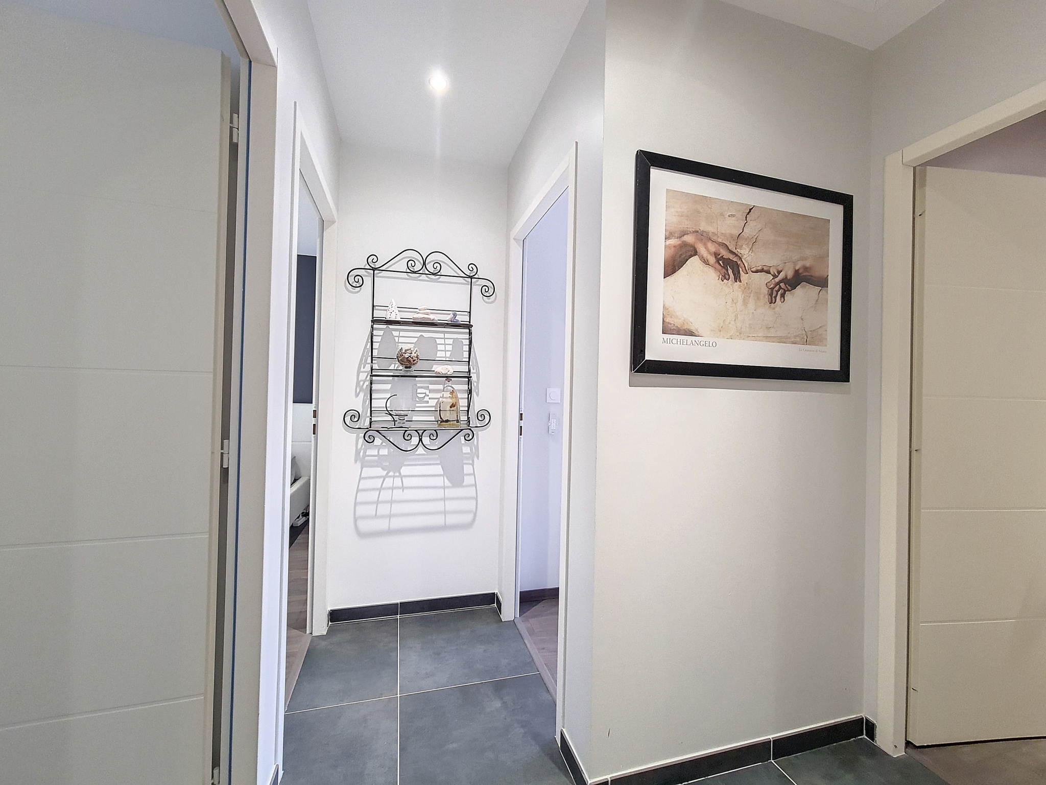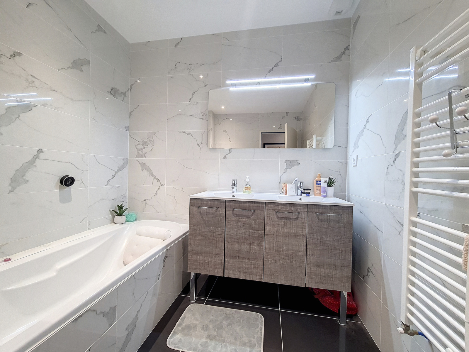 Elle se compose au RDC d'un hall d'entrée, d'une cuisine (Schmidt) équipée et ouverte de 9m², d'un coin cellier, d'un séjour de 31m² donnant sur la terrasse via deux baies vitrées, d'une salle de douche avec Hammam et wc intégré ainsi que d'un coin bureau de 8m² (garage réaménagé).