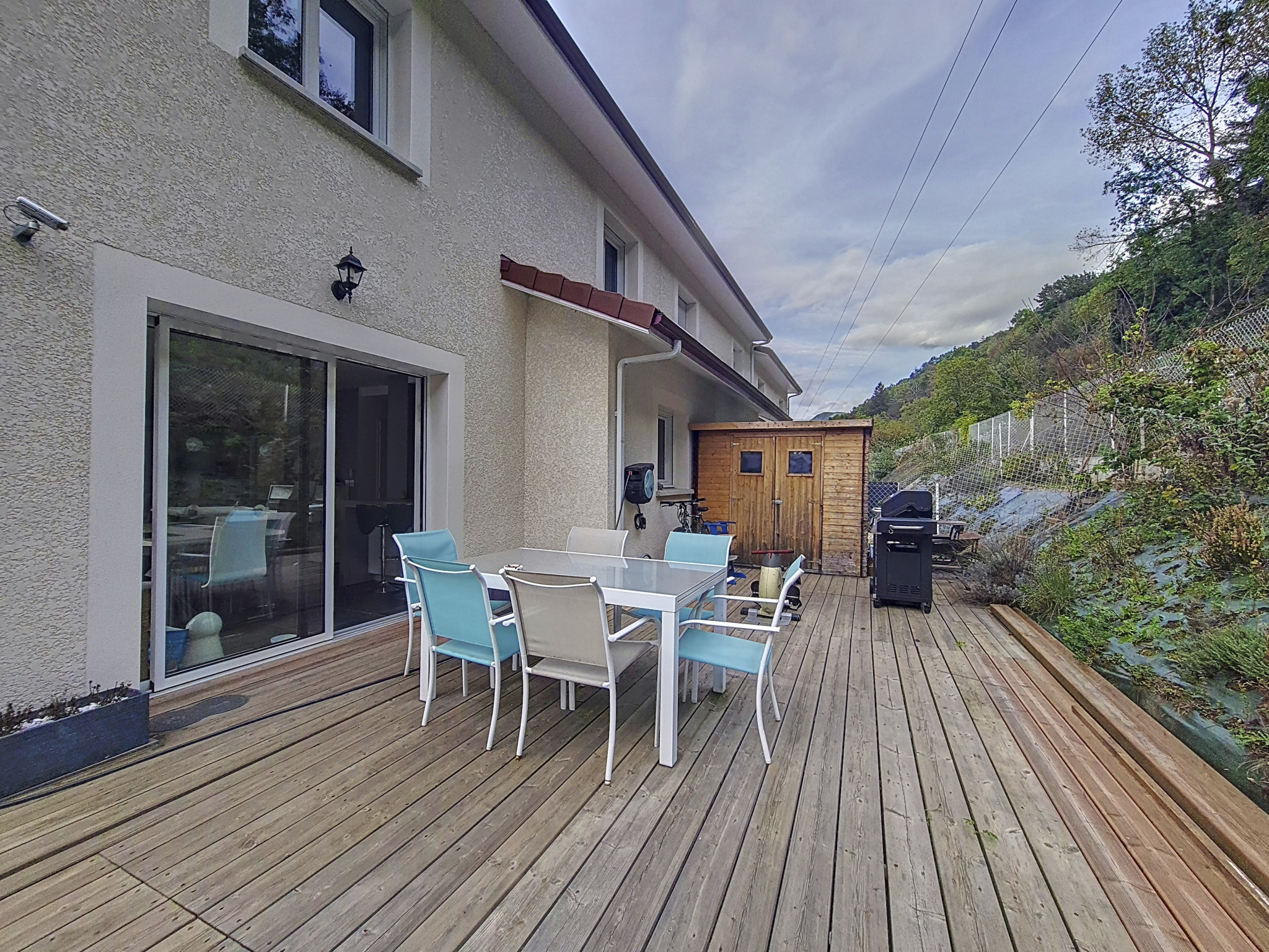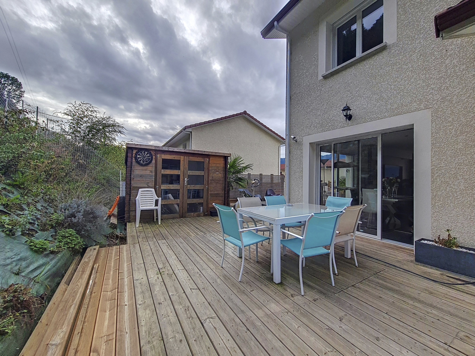 Sa terrasse bois faisant tout le tour de la maison pour environ 254m² comprenant piscine et jaccuzi, offre une vue dégagée sur la Chartreuse et finira de vous charmer !