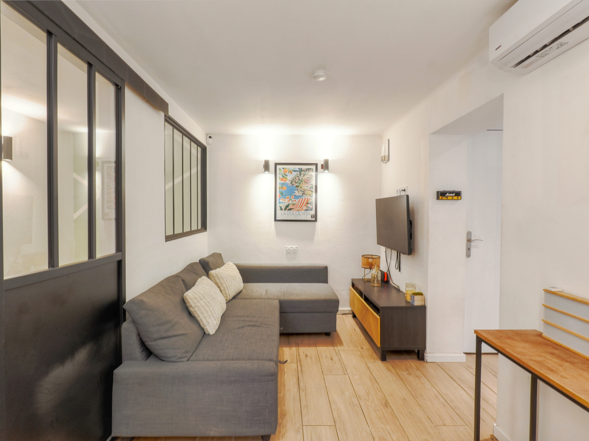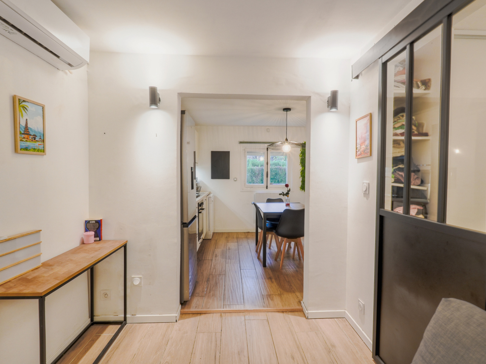 L’intérieur, fonctionnel et soigné, se compose d’une entrée avec rangements, d’une cuisine équipée, d’un séjour, d'une chambre aménagée avec placards intégrés, d’une salle de bains avec douche à l'italienne et WC séparé. Belles prestations avec cuisine équipée, double vitrage PVC, climatisation réversible..